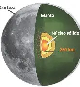 - Corteza, de aproximadamente 80 km de espesor, más delgada en la cara que mira hacia la Tierra y más gruesa en la cara opuesta, a causa de las fuerzas de marea. Corresponde a la superficie lunar que se caracteriza por tener gran cantidad de cráteres.
